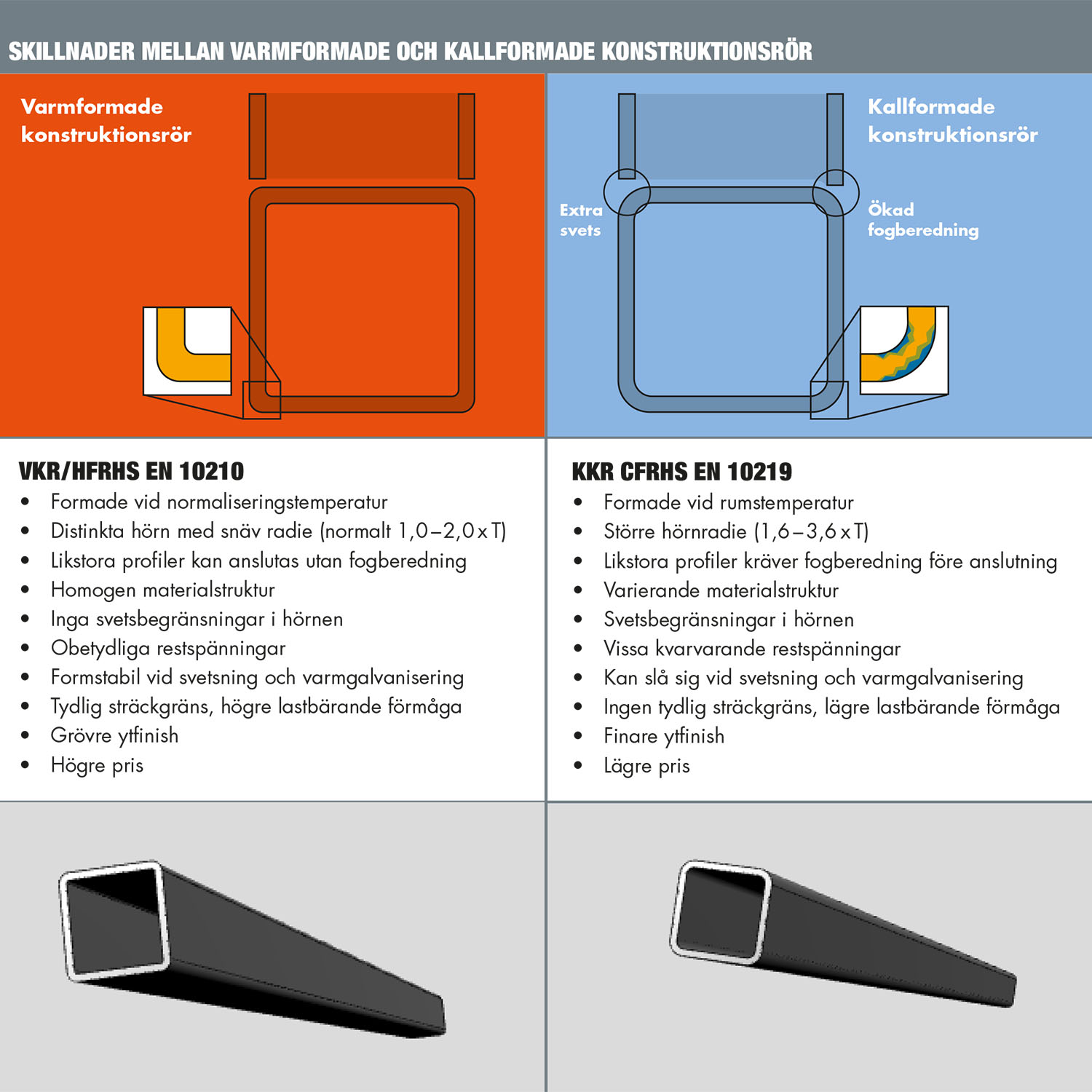 VKR (HFRHS) står för Varmformade KonstruktionsRör (Hot Formed Rectangular Hollow Section) och är en vanlig rörprofil i konstruktionssammanhang. En rektangulär varmformad hålprofil formas i rörverket vid stålets normaliseringstemperatur, omkring 830 – 950°C. Temperaturen gör stålet mjukt och lätt att forma till fyrkantiga rör med snäva hörnradier. Stålet får en homogen materialstruktur utan inbyggda restspänningar och med likformiga egenskaper i hela tvärsnittet. Stålsorten i de VKR-produkter som vi erbjuder från lager är till största delen dubbelklassade och uppfyller kraven för både S355J2H och S355NH, minsta sträckgränsen är 355 N/mm2. Dessa rören är tillverkade av finkornstål i normaliserat tillstånd, fritt från inre restspänningar.