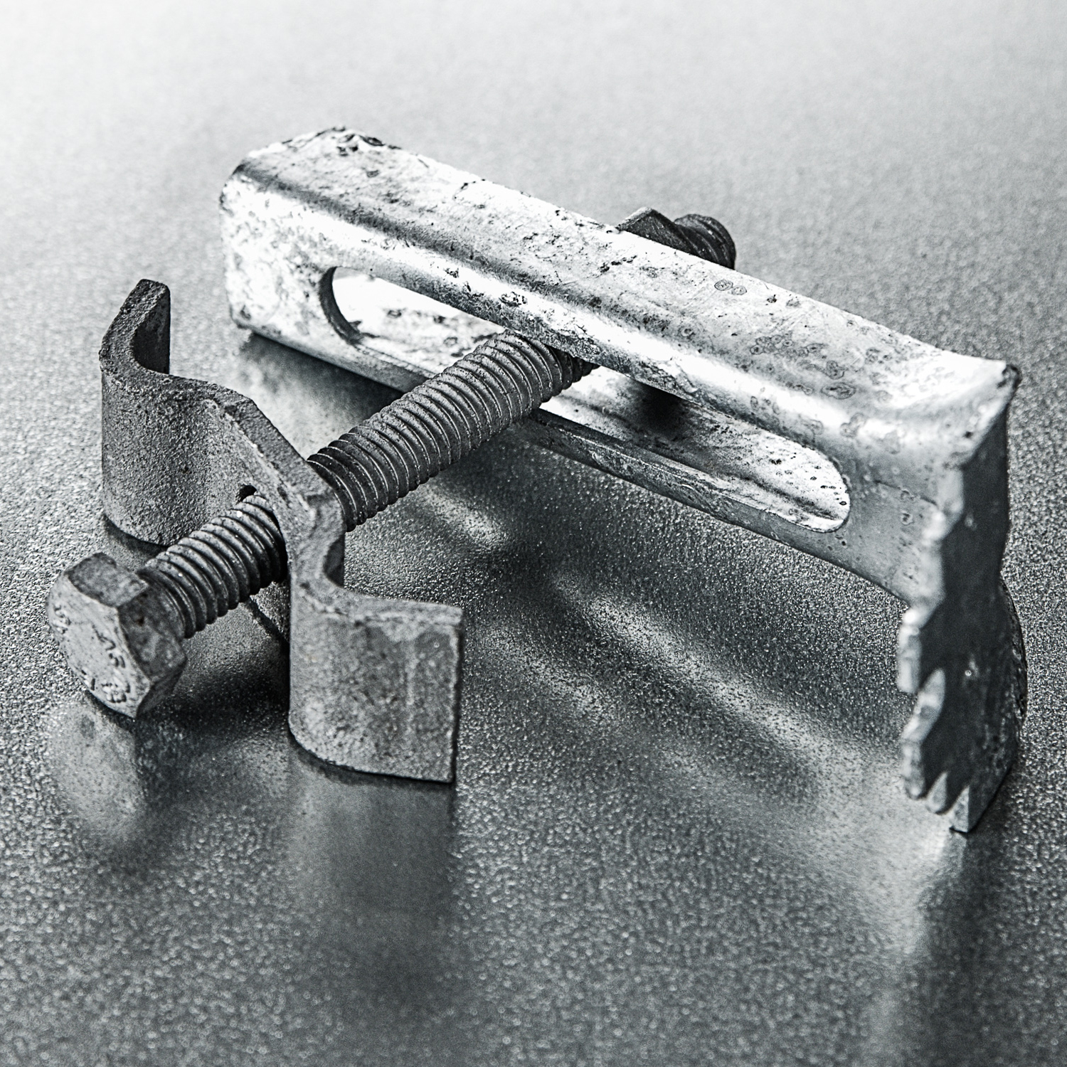 Komplett varmförzinkad fästdetalj till gallerdurk inklusive klammer, underdel, skruv och bult.