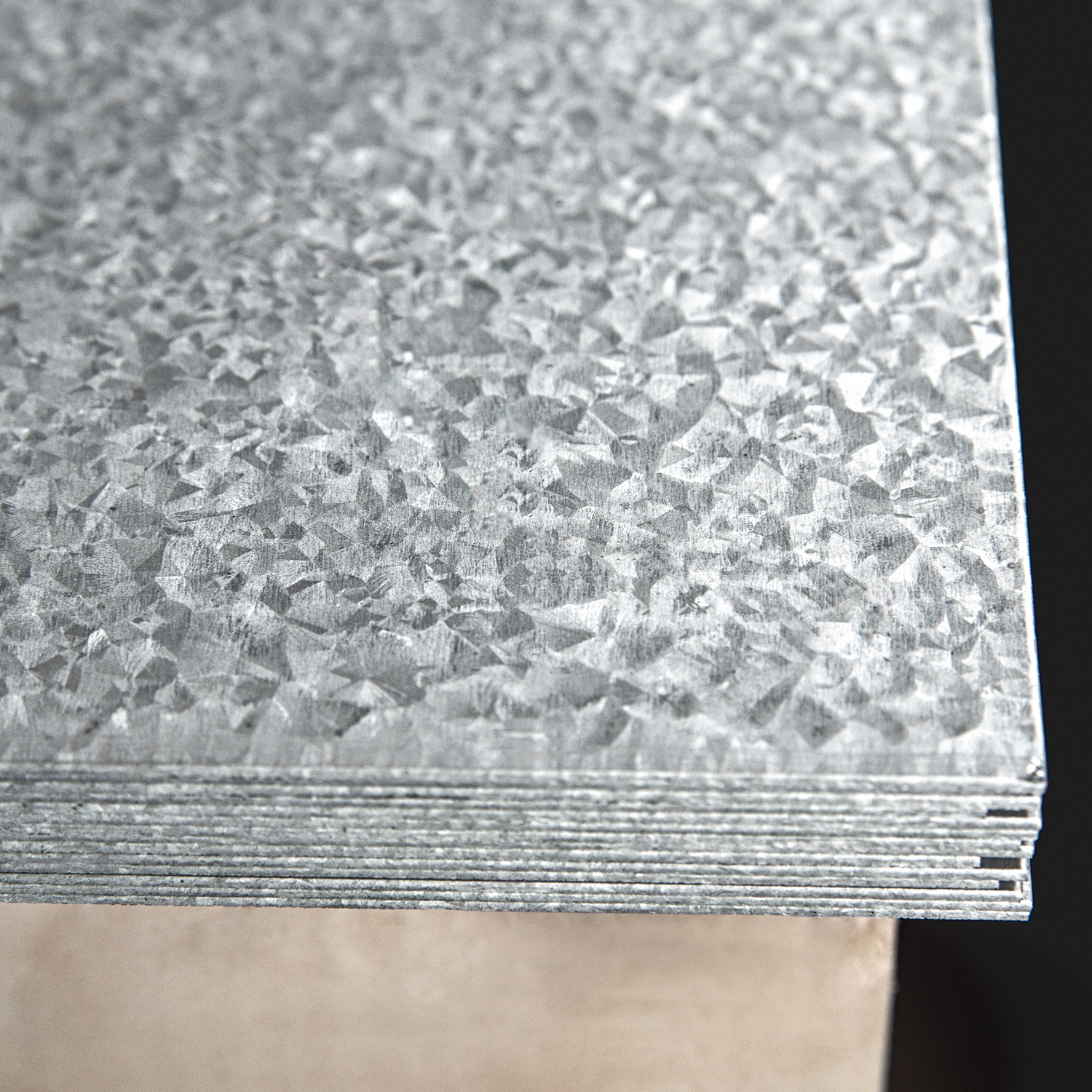 Aluzink plåt DX51D+AZ 150. Plåten är belagd med aluminium och zink för utökat korrosionsskydd.